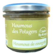 Houmous de courgettesPot 100g Ingrédients : courgettes* (68,05%), pois chiche* (20,42%), purée de sésame* (4,08%), jus de citron*(3,4%), huile d’olive* (2,04%), ail*(1,36%), sel (0.24%), cumin*(0,20%), poivre*(0,20%). * Ingrédient issu de l’Agriculture Biologique |