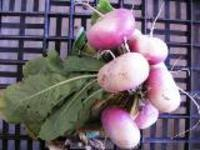 Navet blanc à collet violet (Botte)Plaisirs du jardin - Petit navet frais, saveur sucrée et tendre, à poêler tout simplement Les fanes très grandes se mangent pour accompagner des pâtes juste ciselées dans de l'huile d'olive et revenues à la poële ou tout simplement en soupe. |
