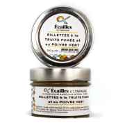 Rillettes de truite fumée au poivre vert (par 12)Réveille les papilles ! Ingrédients : Truite origine élevage (29,2%), Truite Fumée dans notre four à bois (21,6%), crème, eau, beurre, fibres de pomme de terre, lait, sel, poivre vert de Kampot (0,7%) et aromates. |