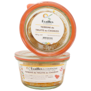 Terrine de Truite & Chorizo de l'Eure (à l'unité)La terre et mer : Ingrédients : Truite (58%), crème, chorizo de la ferme du Louvier – Eure (8,3%) eau, chapelure, fécule, citron, œuf, sel, poivre et aromates. |
