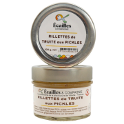 Rillette de Truites aux Pickles de Courgette (à l'unité)Parfaitement acidulée ! Ingrédients : Truite origine élevage (50,5%), crème, eau, Pickles de Courgettes du Domaine de SCIPION (7,7%), beurre, fibres de pomme de terre, lait, vinaigre curcuma, sel, poivre et aromates |