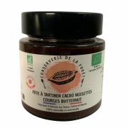 Pâte à tartiner butternut cacaoLa confiture pâte à tartiner cacao noisette courge butternut est une création unique, élaborée sans produit laitier, mais pleine de douceur et de caractère. Le chef d'atelier a imaginé cette recette inédite à partir de butternut français, de cacao maigre, de noisette et d'une touche de sucre blanc pour l'équilibre parfait sans huile de palme ni conservateur. Les ingrédients proviennent des partena |
