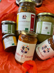 Colis de Noël de la ferme des LogesColis composé d'un ketchup, un coulis de tomates, une ratatouille, un velouté, un pesto et une tartinade. |