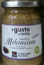 Tartinable d'aubergines - il giusto di Sicilia - 130g - AndiOrigine Italie (Sicile) ; tartinable d'aubergines aux amandes et à l'huile d'olive extra vierge ; aubergines cultivées sur des terres libérées de la mafia |