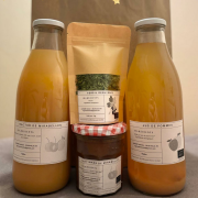 Colis gourmandPlaisir d'offrir ! Le Grand Chêne vous propose son colis gourmand avec ses produits 100% locaux et fait-maison, parfaits pour gâter vos proches. Composition : 1L de nectar de mirabelles, 1L de jus de pommes, 1 pot de tartinade de mirabelle, 1 pot de courgettes aigre-doux, 1 pochon de persil et de céleri déshydraté. |