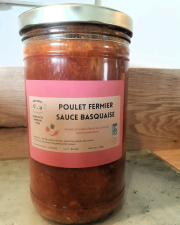 Poulet fermier sauce basquaise - SintesViande de poulet cuisinée dans une sauce tomate, agrémentée de vin blanc, de poivrons, d'ail, de piment d'Espelette AOP Conserve 1 litre Plat pour 2/3 personnes |
