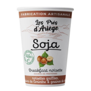 DESSERT SOJA BREAKFAST NOISETTE (400G) LES PRES D'ARIEGEJus de soja* 88,4% (eau, soja* du Sud-Ouest 10,2%), sucre de canne blond* 8,00% (issu du commerce équitable), noisettes grillées en morceaux* 2,00% (Turquie), raisins de Corinthe* 1,00% (Grèce), graines de chia* (Salvia hispanica) 0,60% (France), ferments sélectionnés dont Bifidus. *:ingrédients issus de l'Agriculture Biologique |