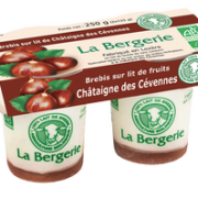 BREBIS SUR LIT DE FRUITS CHATAIGNE DES CEVENNES (2X125G) BERGERIE décolisablePar 6 Ingrédients : lait de brebis entier pasteurisé*, eau, purée de châtaignes des Cévennes* 8 %, sucre de canne non raffiné* 7,5 %, ferments lactiques sélectionnés (lait). * Ingrédient issu de l'agriculture biologique |