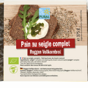PAIN COMPLET SEIGLE (375G)Pural origine Allemagne Ce pain de seigle bio tranché, savoureux et pratique, est élaboré à partir de seigle complet et de levain naturel, issus de céréales fraîchement moulues. Grâce à cette recette authentique, il offre un goût riche et légèrement acidulé, typique du pain au levain. Riche en fibres, 100 % vegan, sans huile de palme, sans additifs ni conservateurs, il allie naturalité et équilibr |