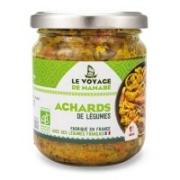 ACHARDS DE LEGUMESLégumes : 50.5 % (Chou vert*, carotte*, chou-fleur*, oignon*, haricot vert*), huile de tournesol vierge*, vinaigre d’alcool*, gingembre*, ail*, sel, épices*(1.1%). *Produit issu de l’agriculture biologique |