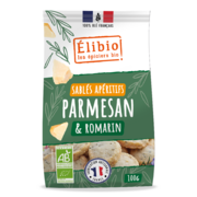 Sablés parmesan et romarinPetits sablés apéritifs au parmesan et au romarin, issus de l'agriculture biologique. Farine de blé*, beurre*, Parmigiano reggiano* 17% (lait*, sel , présure), poudre de lait écrémé*, sucre*, sel , romarin* 1%, poudre à lever: bicarbonate d'ammonium.*issu de l'agriculture biologique. Contient du gluten et du lactose. Fabriqué dans un atelier utilisant des fruits à coque, du soja, des |