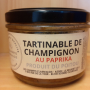 Tartinable de champignons au paprika (180g)Champignon de Paris brun (83%), crème (lait de vache), échalote, paprika (1,3%), sel, agar-agar, poivre. |