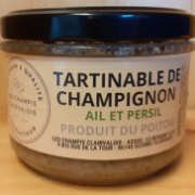 Tartinable de champignon ail et persil (180g)Champignon de Paris brun (83%), crème (lait de vache), échalote, beurre (lait de vache), ail (4%), persil (3%), sel, agar-agar, poivre. |