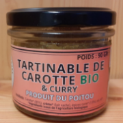 Tartinable de carotte BIO et curry (90g)Carotte* (85%), crème* (lait de vache), épices curry* (1,8%), sel, ail* * Ingrédients issus de l'agriculture biologique |