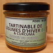 Tartinable de légumes d'hiver BIO & curcuma (90g)Céleri-rave*, navet, oignon*, crème*(lait de vache), sel*, curcuma* (2%), ail*, poivre* * Ingrédients issus de l'agriculture biologique |