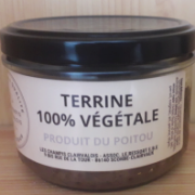 Terrine 100% Végétale (180g)Champignon de Paris brun, Champignon Shiitaké, oignon, noix, oignon, noix, échalote, vin blanc (contient sulfites), miso noir (soja), huile d’olive, sel, persil, cognac, ail, poivre, thym. |