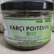 Farci Poitevin Bio (180g)Blette*, épinard*, viande de porc*, chou vert*, oignon*, œuf*, sel, persil*, ail*, poivre, ciboulette* *Ingrédients issus de l'agriculture biologique |