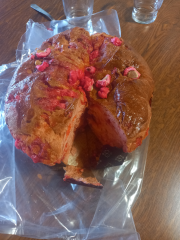 Brioche aux pralines rosesucre, sel, beurre, farine de blé, oeufs, lait, levure, pralines rose |