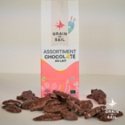 Chocolat de Pâques - assortiment de chocolat au lait 37% - 150gSucre de canne, beurre de cacao, poudre de lait entier(20.5%), cacao, poudre de lait écrémé(8.8%), fleur de sel, poudre de vanille, émulsifiant : lécithine de tournesol |