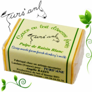 Savon lait d'ânesse et Pulpe de raisinL'extrait de jus de raisin contient une quantité importante d'acides de fruits et donne une action éclaicissante et protectrice sur la peau, d'où éclat du teint, effet anti-vieillissement de la peau, action très hydratante |