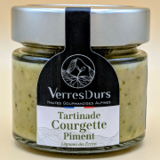 Tartinade Courgette Ail Piment (85g)Tartinade de courgettes Ingrédients : Courgettes (Valgaudemar, 05), Vinaigre balsamique de Modène*, Jus de citron *, Vinaigre de Cidre*, Ail, Sel, Poivre, Piment Pot 85G *ingrédients issus de l'agriculture biologique |