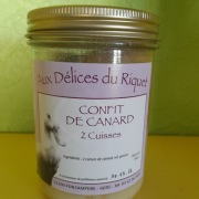 Confit de canard 2 Cuisses (poids net 700g)Suggestion : Pour ôter plus facilement le confit du bocal, maintenir dans de l'eau très chaude quelques instants. Enlever la graisse des morceaux et laisser dorer à la poêle ou au four pour bien griller côté peau. L'accompagner de pommes de terre cuites à la graisse. |