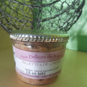 Rillettes de canard (poids net 160g)Ingrédients : Viande de canard, graisse, sel, poivre |
