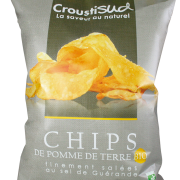 Chips de pommes de terre 100g CroustisudChips de pomme de terre finement salées au sel de Guérande. Sans conservateur. Ingrédients : pommes de terre* 63 %, huile de tournesol* 35 %, sel marin de Guérande 1,3 %. * Ingrédient issu de l'agriculture biologique |
