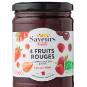Confiture extra 4 fruits rouges, 60 % de fruits Saveurs et FruitsLes framboises de cette confiture ont été cueillies à maturité afin de vous offrir une confiture aussi bonne qu'à la maison ! La méthode douce de cuisson sous vide et à basse température permet aux fruits de conserver toute leur texture, leur couleur et leur saveur. Cette confiture extra avec 60% de fruits garantit un résultat très savoureux et pas trop sucré. Ce format "familial" est pratique e |