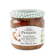 Lentilles saucisses cuisinées aux petits légumes Prosaïneeau, saucisses* fumées au bois de hêtre 18%, lentilles * 17%, poivrons* rouges, carottes*, oignons*, sel de mer, huile d'olive* vierge extra extraite à froid, échalote*, épices*, ail*, plantes aromatiques*. La saucisse fumée est composée de : épaule et échine de porc*, gras dur de porc*, sel, dextrose de maïs*, poivre*, antioxydant: acide ascorbique, menus de porc. *Ingrédients issus de l'ag |