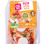 Pizza au pesto de chèvre Osé BioUne pizza colorée, élaborée à partir d'une farine origine France. La pâte façonnée à la main vous surprendra par son côté moelleux à l'intérieur et croustillant à l'extérieur. L'association de dés de tomates, basilic, oignons, ainsi que le fromage de chèvre affiné et le pesto au parmesan donne à cette pizza un goût délicieux et authentique. |