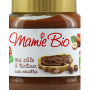 Pâte à tartiner noisette et cacao Mamie bioLa texture et la saveur de la pâte à tartiner bio noisette et cacao, sont particulièrement adaptées au goût des enfants, pour le bonheur des plus grands ! Pâte à tartiner sans huile de palme. sucre de canne brut*, huile de tournesol*, purée de noisettes* 10 %, poudre de cacao maigre* 5 %, poudre de lait écrémé*, beurre de cacao*, farine de soja*, lécithine de soja*, extrait de vanille Bourbon*. |