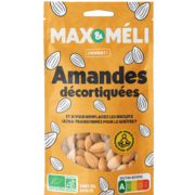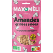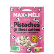 MAX&MELI Pistaches grillées saléesIngrédients : pistaches* 98,3 %, sel 1,7 %. * Ingrédient issu de l'agriculture biologique |