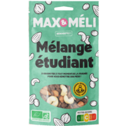 MAX&MELI Mélange étudiantMélange de fruits secs : raisins, amandes, noisettes et noix de cajou.Ingrédients : raisins secs*, raisins* 99,5 %, huile de tournesol*, amandes*, noisettes*, noix de cajou*. * Ingrédient issu de l'agriculture biologique |