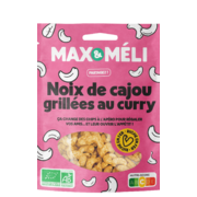 MAX&MELI Noix de cajou grillées au curryIngrédients : noix de cajou* 94 %, curry* 2,5 % (curcuma*, graines de coriandre*, amidon de pomme de terre*, sel, gingembre*, fenouil*, clous de girofle*, ail déshydraté*, piment de Jamaïque*, cannelle*, sarriette*, origan*, thym*, romarin*, basilic*, moutarde*), sel 2,5 %, gomme d'acacia* 1 %. * Ingrédient issu de l'agriculture biologique |