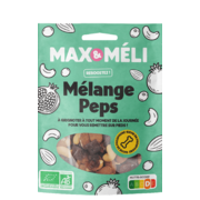 MAX&MELI Mélange PepsNotre mélange PEPS parfait pour les pauses gourmandes, allie le croquant des fruits secs et le peps de notre ingrédients secret il saura ravir les palais les plus exigeants.Ingrédients : amandes*, raisins secs* (raisins* 99,5 %, huile de tournesol*), noix de cajou*, pâte de grenade* (purée de grenade* 76,5 %, jus de pomme concentré*, gélifiant (pectine d'agrumes), farine de riz*), canneberges* (c |