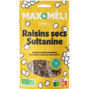 MAX&MELI Raisins Sultanine, TurquieTout simplement séchés sous le soleil de Turquie pendant une dizaine de jours, le raisin Sultanine est une variété apyrène (naturellement sans pépins). Raisin assez clair mais légèrement plus charnu et moins sec. Produit filière.Ingrédients : raisins sultanine* 99,96 %, huile de tournesol* 0,04 %. * Ingrédient issu de l'agriculture biologique |