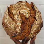 Pain complet[Ingrédients : farine bio de blé (type 150), levain naturel de blé, sel, eau] Ce pain apporte de nombreux bienfaits, tels des minéraux sans produits chimiques assimilables grâce au levain et un apport en fibres élevé pour une excellente régularisation du transit. Poids par pièce* : 600 g Prix au kg : 6,70 € |