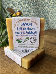 Savon Lait de chèvre Cèdre & PatchouliSavon surgras à base d'huile d'olive, de beurre de coco, de beurre de karité, de lait de chèvre, d'huiles essentielles (cèdre & patchouli) et d'argile rouge. Saponification à froid, fabriqué à la main |