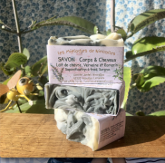 Savon Corps & Cheveux Lait de chèvre, Verveine et RomarinSavon shampoing à base d'huile d'olive, de beurre de coco, de beurre de karité, d'huile de ricin, de lait de chèvre, d'huile essentielle et de verveine sèche Saponification à froid, naturellement doux pour la peau et fabriqué à la main. |