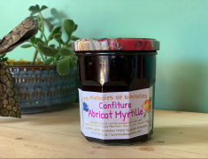 Confiture Abricot MyrtilleAbricots AB Myrtilles sauvages ramassées en Haute Loire Sucre AB |