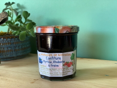 Confiture Myrtille, Rhubarbe & FraiseMyrtilles sauvages ramassées en Haute-Loire Rhubarbe cultivée sur la ferme Fraises cultivées sur la ferme Sucre AB |