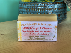 Savon Corps & Cheveux Cire d'abeille, miel et camomilleSavon Shampoing à base d'huile d'olive, de beurre de coco, de beurre de karité, d'huile de ricin, de cire d'abeille, de miel et de camomille Saponification à froid, surgras, naturellement doux pour la peau et fabriqué à la main |