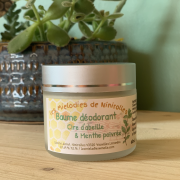 Déodorant Cire d'abeille & menthe poivréeBaume déodorant solide pour les aisselles à base de beurre de coco, bicarbonate de soude, fécule de maïs, cire d'abeille et huile essentielle. Contenant en verre, Sans aluminium, Sans sel d'aluminium |