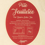 PATE FEUILLETEE 3KG à découperD.L.C. : 30 jours au réfrigérateur entre 0° et 4° C. 12 mois au congélateur à -18°C. Composition : Farine de gruau 50 %, beurre extra fin A.O.P.Charentes Poitou 33%; eau; sel . * fabrication du beurre 72 heures maximum après la traite. |