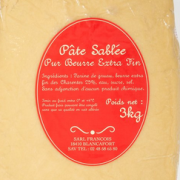 PATE SABLÉE 3 KG à découperComposition : Farine de gruau 50 % ; beurre extra fin A.O.P.CharentesPoitou 25% ; sucre 15% ; eau ; sel.D.L.C. : 30 jours au réfrigérateur entre 0° et 4° C. 12 mois au congélateur à -18°C. |