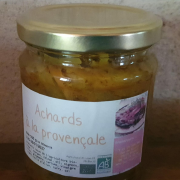 Achards à la provençale ABAchards à la provençale bio. Le pot de 160 gr. Mélange de courge, coing, ail, oignon, carottes, gingembre, curcuma, vinaigre de cidre, huile d'olive, curry et sel |