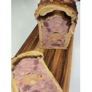 Pâté en croûte au foie grasPâté en croûte : veau, porc, canard, échalotes, sel, poivre, porto, vin blanc, gelée, farine, ŒUFS, eau, BEURRE |