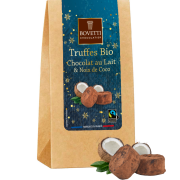 Truffes bio choc. lait et noix de coco 120gTruffe au chocolat au lait et à la noix de coco enrobée d'une fine poudre de cacao bio |