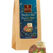 Truffes bio choc. blanc et éclats de pistaches 120gTruffes bio, un coeur tendre au chocolat blanc fondant et le croquant des éclats de pistaches, sublimée par une saveur délicatement cacaotée |
